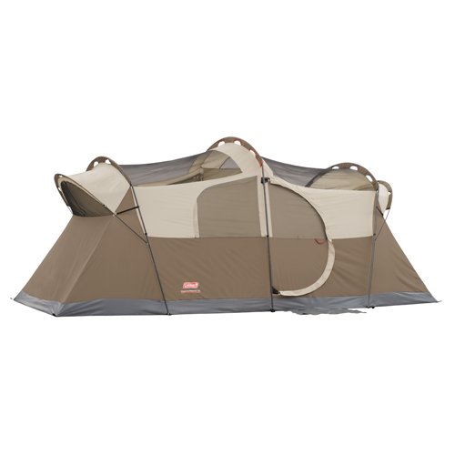 With its cabin-like design and plenty of room to stand and move, the Coleman WeatherMaster 10-Person Tent feels more like a house than a tent. This ten-person, two-room tent offers ample space for sleeping or sheltered relaxation. Get in and out easier with two doors - a hinged front door and a zippered back door. Its Variflo adjustable ventilation system allows you to customize your cooling comfort. If it rains, reverse-angled windows let in the light and air, but not the water even when they're open. The built-in WeatherTec Systems patented welded floors and inverted protected seams help ensure you stay dry. Spend more time enjoying the scenery with color-coded poles and continuous pole sleeves that allow you to set the tent up easier. Inside, the 17 ft. x 9 ft. floor is large enough to fit ten people or three queen size airbeds. When the fun is done, it folds up to fit inside a carry bag for convenient transport.